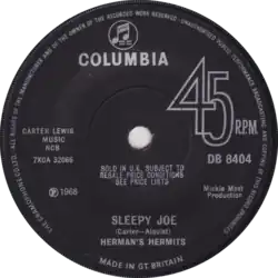 "Sleepy Joe" is a song written by John Carter, and Russell Alquist and performed by Herman's Hermits. It reached #4 in New Zealand, #9 in Canada and Ireland,[1] #10 in Norway, #12 in the United Kingdom, #17 in Sweden, #18 in South Africa,[2] #21 in Australia, #61 in the United States, and #37 in Australia in 1968.[3]