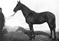 Slieve Gallion's colour was controversial: he was officially described as a black horse,[2] although his portrait suggests that he was a dark-coated bay,[1] and some argued that he was an unusually dark chestnut.[3] He was bred in England by the Irish breeder Henry Greer, who owned the colt during his racing career. Greer named the colt after a mountain in County Londonderry. He was sired by Greer's stallion Gallinule, a moderate racehorse who became a highly successful sire of winners, being the Leading sire in Great Britain and Ireland on two occasions.[4] Greer sent the colt to be trained by Sam Darling at Beckhampton.[5]