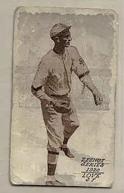 At the end of the 1913 minor league season, the Washington Senators purchased Love from the Atlanta Crackers.[11][12] Love made his major league debut for the Senators on September 8, 1913, at age 23.[1] In his debut, Love pitched one inning against the New York Yankees and allowed no hits, no bases on balls, and no runs, and struck out one batter.[13] Love became the tallest pitcher in major league history, surpassing Hippo Vaughn who stood six feet, four inches. Love remained the tallest pitcher in major league history for 69 years until Stefan Wever made his debut in 1982 at six feet, eight inches.[11] He compiled a 1–0 record and 1.62 ERA in five games and 16-2/3 inning pitched.[1]