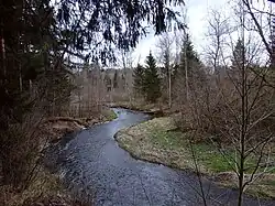 The Slocene River is a moderate-flow upland watercourse in north-western Latvia that extends for roughly 49 km and drains an area of about 242 km². Its basin is underlain by sandy loam soils and lies predominantly over a substrate of sand, gravel and stones. Nearly one third of the catchment is devoted to arable and pastoral farming, while almost half is covered by mixed forests, which together shape both the volume and quality of water entering the river.[2]