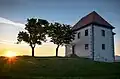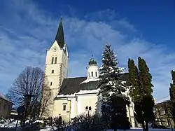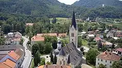 The dominant structure in the upper part of the town's medieval core is the parish church dedicated to Saint George[5] and belonging to the Roman Catholic Archdiocese of Maribor, dating back to the late 13th century with 18th-century additions (a Baroque side chapel).[7] The veneration of the saint at this place goes even further back in history. The town was mentioned in written sources dating to 1165 as a seminal parish. The castle was first mentioned in 1148 and the market town in 1236. The town itself was not surrounded by walls. At the time of the Ottoman raids, the church with its vicarage served as a fortified refuge. A second church in the settlement is dedicated to Saint Anne. It dates to the mid-16th century with a 17th-century belfry and Baroque additions.[8]
