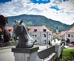 Above Old Square (Slovene: Stari trg) stands the medieval Trebnik Mansion.[6] The more than 860-year-old dense town line is a sloping square, from Trebnik Mansion past St. George's parish church, along a small stream in an open channel, down to the Dravinja River. The new Town Square (Mestni trg) is on the other bank of the river, connected with Old Square by a bridge with four horse heads on the corners.