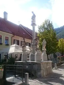 The main street and the transversal connections above the Dravinja are lined with longitudinal or transversally positioned one-storey houses with well-preserved Gothic cores and Renaissance additions. The façades were restyled in the 19th century (Biedermeier, Historicism). A rarity is the Art Nouveau building of the former savings bank. A Marian column dating to the mid-18th century and a column shrine dedicated to Saint Florian above the stream (both designed by the local artist Franc Zamlik in 1750) dominate the open square. The town core is well preserved.