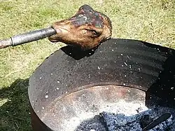 Smalahove (also called smalehovud, sau(d)ehau(d) or skjelte) is a Western Norwegian traditional dish made from a sheep's head, originally eaten before Christmas.[1] The name of the dish comes from the combination of the Norwegian words hove and smale. Hove is a dialectal form of hovud, meaning "head" (cf. Hǫfuð), and smale is a word for sheep, so smalahove literally means "sheep head".[2][3] The skin and fleece of the head are torched, the brain removed, and the head is salted, sometimes smoked, and dried. The head is boiled or steamed for about three hours, and served with mashed swede/rutabaga and potatoes. It is also traditionally served with akevitt.[4] In some preparations, the brain is cooked inside the skull and then eaten with a spoon or fried.[5] Originally, smalahove was typically eaten by the poor.[6]