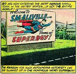 In the original Superboy comics, a billboard outside of Smallville greets those driving into and out of town. The billboard features a picture of Superboy waving, with words next to it reading: "Welcome to Smallville, Home of Superboy".[19]