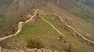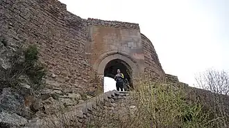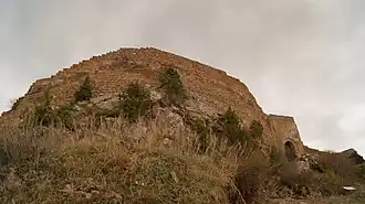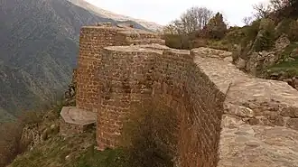 Smbataberd is located at the top of a mountain ridge to the east of the village of Artabuynk and to the west of Yeghegis, at a height of 2000 meters.[5][6] It was built in a very advantageous position, guarded by steep cliffs on its eastern, western and southern sides, which are further reinforced by the fortress walls.[7][8] The large, pyramidal defensive walls that completely surround the fortress are relatively well preserved.[4][7][8] The walls are made of large, wedge-shaped, hewn basalt stones as well as unworked stones, held together with lime mortar.[4][8][9] The walls are 2–3 meters thick,[8][10][9] and the semi-circular towers along the wall are 8–10 meters tall.[10] The fortress is divided by a wall into northern and southern sections, each of which had its own keep.[2][9] Within the confines of the fortress little remains except for the faint foundations of buildings near the fortification walls and the keep located at the highest point of the site.[7] Some ruins of habitable buildings and cisterns have been preserved.[9] Part of the structures within Smbataberd were probably special princely living quarters built during the 13h century.[4] The fortress has three entrances։ northern, eastern and western, but it can only be approached and entered from the northern, main entrance.[4][10] The northern and eastern entrances are hall-like, with ruins of guardhouses and watchtowers above them.[10] The fortress received its water supply from springs near Tsaghats Kar Monastery through a water pipe.[9]