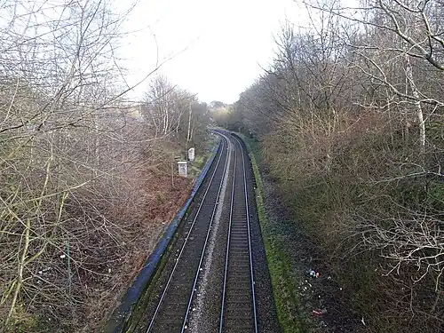 ![]() The site of Smethwick West station in 2018, with overgrown platforms still in situ. | |||||