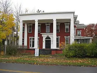 Smith-Ely Mansion is a historic home located at Clyde in Wayne County, New York. It is a large, 2½-story brick masonry residence featuring elements of the Classical Revival style. The original house was built about 1850 and extensively altered in 1875–1877. That renovation added an extensive verandah and 3-story tower. The front is dominated by a colossal, four-columned portico added during a renovation dated to 1908–1911.[2]