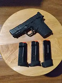 Smith & Wesson introduced the Sigma series of recoil-operated, locked-breech semi-auto pistols in 1994 with the Sigma SW40F, followed by the Sigma SW9F 9 mm, which included a 17-shot magazine.[40]Glock initiated a patent infringement lawsuit against Smith & Wesson. The latter paid an undisclosed amount to settle the case and for the right to continue producing models in the Sigma line.[56] The gun frame is manufactured from polymer, while the slide and barrel use either stainless steel or carbon steel. In 1996, Smith & Wesson updated the Sigma by adding a compact model with a shortened barrel (from 41⁄2 to 4 inches) and again, in 1999, modified the series by changing the grip by adding checkering and adding an integral accessory rail for lights and laser targeting devices.[40]
