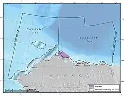 There is a known oil seep at Cape Simpson on the western side of Smith Bay. In 2015 and 2016, Caelus Energy Alaska drilled two exploration wells in the southern part of the bay, about 59 miles (95 km) southeast of Barrow.[8] In October 2016, the company announced what it called a major oil discovery in the bay[9] and said it would drill a third well in January 2018 and proceed with permitting a pipeline afterwards.[10] A pipeline under the Chukchi Sea or a pipeline on land close to "Qupaluk" ("small bird" in the Inupiaq language) would be required, threatening the habitat of at least 30,000 migratory birds.[11]