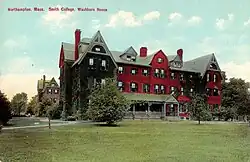 When Smith College first opened its doors to students in 1875, there were few precedents for how a women's college should build its dorms. Unlike the two already existing women's colleges, Mount Holyoke and Vassar, the Smith trustees decided to abandon the model of a large building with many individual student rooms. Instead, they took over a house that had belonged to a local family, Dewey House, in order to give their students a domestic space. Dewey House, designed by Thomas Pratt in 1827 for Charles A. Dewey, was a three-story home with a front porch, parlor, large dining room, and a bedroom for each of the incoming students.[1]