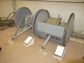 The Smith Gun consisted of a 3-inch (76 mm) calibre smooth-bore barrel,[4] 54 inches (1,400 mm) in length,[9] and mounted on a carriage 'like a two-wheeled baby carriage',[4] but weighing approximately 604 pounds (274 kg).[9] A basic shield was provided between the two wheels to cover for the crew[10] but one of the unconventional aspects of the design was when mobile the weapon lay on its side, so that to fire a Smith Gun had to be tipped over onto one of the wheels, which acted as a combined base plate and turntable, while the other proved some overhead protection for the crew. (This meant in firing configuration the Smith Gun resembled a miniature, rather antiquated, naval gun mount of the pre-Dreadnought era.)