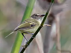 The smoky-fronted tody-flycatcher was originally described in 1853 as Todirostrum fumifrons.[4] Following a 1988 publication, taxonomic systems moved fumifrons and several other species from Todirostrum to genus Poecilotriccus. By the early twenty-first century genus Poecilotriccus had species called both "tody-tyrant" and "tody-flycatcher" so taxonomic systems began renaming the "tyrants" to "flycatcher".[5][6][7] The smoky-fronted tody-flycatcher shares genus Poecilotriccus with 11 other species.[2] It and the rusty-fronted tody-flycatcher (P. latirostris) form a superspecies.[5]