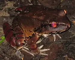 The smoky jungle frog (Leptodactylus pentadactylus) is a species of frog in the family Leptodactylidae. It is found in northern South America as well as parts of Central America.[2] Its natural habitats are tropical and subtropical moist broadleaf forests, subtropical or tropical swamps, subtropical or tropical moist montane forest, rivers, freshwater marshes, intermittent freshwater marshes, and aquaculture ponds.