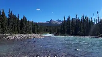 The Snake Indian River is a large tributary of the Athabasca River, exiting entirely within Jasper National Park. The Snake Indian forms at Snake Indian Pass, south of Monte Christo Mountain and Snake Indian Mountain, north of Calumet Peak. The river travels in a general northwest direction before turning sharply south. The river plummets over the massive Snake Indian Falls before joining the Athabasca River downstream of Jasper Lake, near the east gate of Jasper National Park.[1]