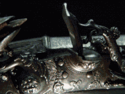 In all snaplocks, the flint is held in a clamp at the end of a bent lever called the cock. When the gun is "cocked", the cock is held back, against the pressure of a spring, by a catch which is part of the trigger mechanism. When the trigger is pulled, the catch is released and the spring moves the cock rapidly forwards. The flint strikes a curved plate of hardened steel, called the "steel". The flint strikes from the steel a shower of white hot steel shavings (sparks) which fall towards the priming powder held in the flash pan. The flash from the pan's ignited primer travels (unless there is only a "flash in the pan") through the touch hole into the firing chamber at the rear of the barrel, and ignites the main charge of gunpowder.[1]