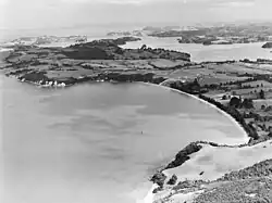 Mahurangi peoples primarily focused settlement along the shores of the Hauraki Gulf,[14][15] moving between different kāinga based on available seasonal resources.[16] Snells Beach and adjacent Algies Bay (Horahorawai)[17] were protected by headland pā to the north and south, which looked out towards Kawau Island and Moanauriuri (Kawau Bay), an important shark fishery.[18][15] Archaeological middens and terraces have been discovered in the areas adjacent to the north and south headlands of Snells Beach.[18]