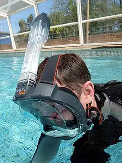 Some snorkels have a sump at the lowest point to prevent a small volume of water remaining in the snorkel from being inhaled when the snorkeler breathes. Most of these also have a non-return drain valve in the sump, to drain water from the tube when the diver exhales. The water is pushed out through the valve when the tube is blocked by water and the exhalation pressure exceeds the water pressure on the outside of the valve. This is similar to the mechanism of blast clearing which does not require the valve, but the pressure required is slightly less, and effective blast clearing may require a higher flow rate. When the water level in the snorkel drops sufficiently for exhaled air to bypass over the water, much of the effectiveness of the drain valve is lost, and the remaining water may not all be ejected. The full-face snorkel mask may have a double airflow passage with non-return valves to reduce dead space in the tubes, one tube providing inflow and the other for outflow, but the interior of the mask remains a large dead space unless an orinasal pocket is included. The full-face mask encloses the nose and mouth in the same volume which is connected to the snorkel tube or tubes, which allows breathing through the nose in addition to the mouth.[60] A few "dry" models of separate snorkel have float-operated valves attached to the top end of the tube to keep water out when a wave passes, but these cause problems when diving as the snorkel must then be equalized during descent, using part of the diver's inhaled air supply. Some recent "semi-dry" designs come with a splash deflector on the top end to reduce entry of water that splashes over the top of the tube, thereby keeping it relatively free from water at the surface.[61]
