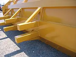 Snow pusher designs vary across the industry. They are typically between 3 ft [0.9 m] and 5.5 ft [1.6 m] high and range from 6 ft [1.8 m] to 40 ft [12.2 m] wide. Snow pushers are typically mounted on wheel loaders, skid steers, or backhoes. For wheel loaders and backhoes, they are mounted using a universal mounting system that consists of a set of posts (or plates) between which the machine bucket is placed. Chains are attached to the snow pusher and the bucket and tightened using a chain binder. This system allows for snow pushers to be mounted on any machine without regard for brand-specific mounting brackets. Skid steer loaders can use the universal mounting system;[1] however, most manufacturers typically offer skid steer snow pushers with a universally accepted quick-attach system. Though the snow pusher might seem like a simple product, there are many variations across the industry in areas such as moldboard height and angle, sidewall support system (post, wedge, or unsupported), trip edge system, shoe thickness, and rubber cutting edge quality, to name a few.