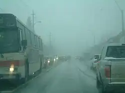 Both types of snow squalls are very dangerous for motorists, airplanes, and other travelers; even can be more dangerous than blizzards.[7] The change in conditions is very sudden, with slippery conditions and abrupt loss of visibility due to whiteouts, which often cause multiple-vehicle collisions. In the case of lake-effect snow, heavy amounts of snow can accumulate in short periods of time, possibly causing road closures and paralyzing cities. For instance, on January 9, 2015, a localized, heavy snow squall caused a 193-vehicle pile-up on I-94 highway near Galesburg, Michigan.[8] On very rare occasions, particularly powerful snow squalls can even become supercells and form tornadoes, even if no lightning or thundersnow is present.[9]