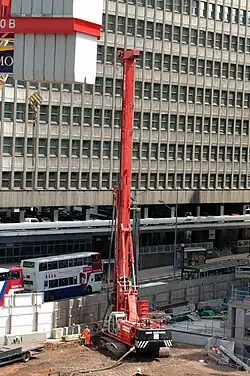 For the work at basement level at Phase 4, Bachy Soletanche used two 50-tonne (49-long-ton) support cranes and two Bauer BG 22 piling rigs.[77] Construction of Phase 3 is being assisted by three tower cranes. The first crane to be assembled, TC3, is to be the shortest of the three tower cranes. It has a maximum height of 45 m (148 ft) and has a luffing jib. It was built in one stage. It is a free standing crane and will allow podium level construction. Once construction at podium level is completed, it will be dismantled and replaced by two number gantry joists.[86]