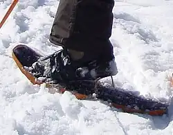 In fixed-rotation bindings, the binding is attached to the snowshoe with an elastic strap that brings the tail of the snowshoe up with each step. The snowshoe therefore moves with the foot and the tail does not drag. Fixed-rotation bindings are preferred for racing.[13] Full-rotation bindings allow the user's toes to pivot below the deck of the snowshoe. They allow the crampon cleats that are under the foot to be kicked into a slope for grip in climbing, but are relatively awkward for stepping sideways and backwards as the tail of the snowshoe can drag. Fixed-rotation bindings often cause snow to be kicked up the back of the wearer's legs; this does not tend to happen with full-rotation bindings.