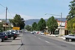 The western section begins at the Bombala and Sharp Street roundabout in Cooma. The highway takes on the name Sharp Street from this intersection as it heads west within Cooma urban area. Upon leaving Cooma, the road heads west via farmland to the village of Pine Valley. Here the road meets a T-intersection, with through traffic taking Kosciuszko Road southwest towards Jindabyne. The highway turns to continue on its westerly heading. The roadway then makes its way through undulating terrain for some distance before it passes through Adaminaby, and on into Kosciuszko National Park. The park boundary is marked by a sign, there are no park entry gates on the highway, and park entry fees are not payable. The road winds through mountainous terrain as it climbs towards the abandoned mining settlement of Kiandra, situated at an altitude of around 1,400 m (4,600 ft). The landscape becomes open grassland at this point and remains relatively flat as the road continues relatively gently up an alpine valley created by the Eucumbene River and its numerous tributaries. At the top of the valley the road reaches its highest point a little below 1,500 m (4,900 ft). The road then descends into part of a similar valley created by the Murrumbidgee River as it passes by the access roads for Yarrangobilly Caves. The highway then veers northwest back into forested terrain and continues along the same rough heading through hilly terrain for some distance before a mountainous descent from 900 to 400 m (3,000 to 1,300 ft), near the town of Talbingo which is located a few kilometres west of the highway. Continuing on, the roadway passes by Jounama Dam and then roughly parallels the eastern side of Blowering Reservoir (created by Blowering Dam further downstream). It then leaves the National Park descending into farmland on the Tumut Plains, roughly 300 m (980 ft) above sea level.[4][5]
