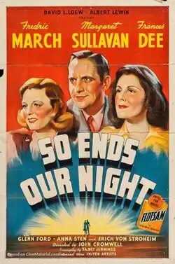 So Ends Our Night is a 1941 American drama film directed by John Cromwell and starring Fredric March, Margaret Sullavan and Frances Dee. The screenplay was adapted by Talbot Jennings from the novel Flotsam by German exile Erich Maria Remarque, who rose to international fame for his first novel, All Quiet on the Western Front.