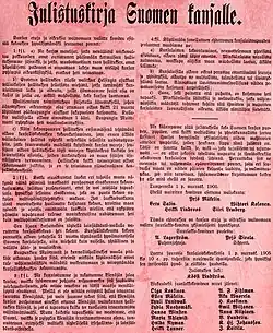 The labour movement in Finland began to gain new found popularity in Finland due to the attempted Russification of Finland (1899–1905), defeat in the Russo-Japanese War and growing class consciousness amongst Finns.[6] The Social Democrats grew fast in popularity and were unordinary compared to the Russian Socialists, who were forced to operate underground.[7] All camps of the political spectrum grew to disdain the Russian Governorship, especially the nationalists, leading to the assassination of Nikolai Bobrikov by Eugen Schauman.[6]