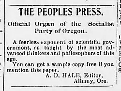 - ^ See, for example: "Douglas County Socialists Nominate," Eugene Guard, vol. 30, no. 53 (March 5, 1906), pg. 4; "Socialists Hold Their Convention," [Lane County] Eugene Guard, vol. 30, no. 64 (March 17, 1906), pg. 8.