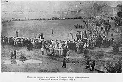 The Russian Empire annexed Abkhazia in the early nineteenth century and had consolidated its authority over the region by 1864.[3] Reluctant to create ethno-territorial units, the Russian authorities incorporated the region into the Kutais Governorate.[4] Large-scale population transfers saw the ethnic composition of Abkhazia radically altered, with thousands of ethnic Abkhaz expelled and ethnic Mingrelians brought in to replace them.[5][6] After the 1917 February Revolution, which ended the Russian Empire, the status of Abkhazia became contested and was unclear.[7] Free from Russian rule, it considered joining the Mountainous Republic of the Northern Caucasus in 1917, but ultimately decided against this due to the distance between Abkhazia and the rest of the groups involved, but in Abkhazia, clashes continued with the nationalists, who were supported by the Mountainous Republic and the Socialist Party of Abkhazia, who were supported by the Russian Soviet Federative Socialist Republic. In response the Mountainous Republic declared Abkhazia its territory.[8][9] In February 1918, Abkhaz Bolsheviks attempted to create a commune—a similar system to the soviets (councils) being formed in Russia. This effort was unsuccessful and the Bolshevik leaders, Efrem Eshba and Nestor Lakoba, fled.[10] The Abkhaz People's Council (APC) was formed in the aftermath and effectively controlled the region. When the Democratic Republic of Georgia was formed in May 1918, it annexed Abkhazia, considering it an integral part of its territory. Georgia never fully established control of the region, leaving the APC to rule it until the Bolshevik invasion of 1921.[11]