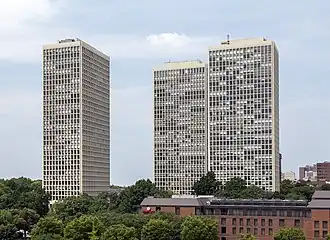 The Society Hill Towers are a three-building condominium complex located in the Society Hill neighborhood of Philadelphia, Pennsylvania. The complex contains three 31-story skyscrapers with 624 units on a 5-acre (2.0 ha) site.[1] The towers were designed by I. M. Pei and Associates and are constructed of cast-in-place concrete, with each apartment featuring floor-to-ceiling windows.[2] Completed in 1964, the apartments were originally rental units but were converted to condominiums in 1979.[1]