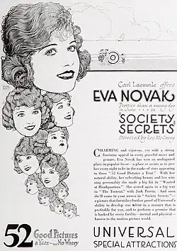 Society Secrets is a 1921 American silent satire film, directed by Leo McCarey. It stars Eva Novak, Gertrude Claire, and George Verrell, and was released in February 1921. It marked McCarey's directorial debut. McCarey didn't make a further feature film for eight years as he concentrated on writing and directing shorts.[2][3]