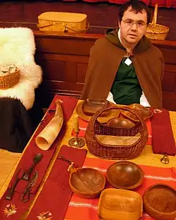 An SCA participant in historically based clothing prepared for a feast
