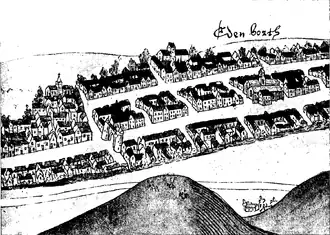 Sketch of Edinburgh made in 1544 looking south, showing the Netherbow Port between the High Street and the Canongate; published in the Proceedings of the Society of Antiquaries of Scotland in 1933.