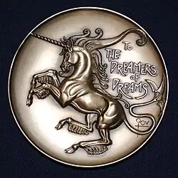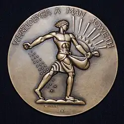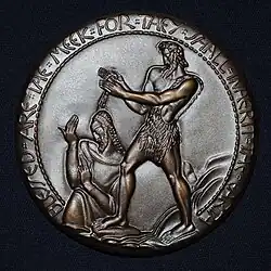 Although the official date of establishment was 1930, there was a public notice for the organization in the January 1929 edition of The Numismatist, the journal of the American Numismatic Association.[1] The notice also stated that, "The Society of Medalists had its inception at the convention of the American Federation of Arts in Washington last May" (May 1928).[1] The notice further stated, "The organization committee is composed of George D. Pratt, Robert W. DeForest and Alexander B. Trowbridge", however, later documents attributed the founding entirely to Pratt.[1] Additionally, the notice discussed that, "Exceptionally accurate machinery makes it possible to strike medals to the quantity of 1,000 or more for very low cost."[1]