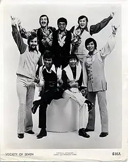 The Society of Seven (SOS) is a musical group that performs a variety show of the same name. Based in Hawaii, it was formed in 1969 from the pop group known as the Fabulous Echoes, which originated in Hong Kong in the early 1960s.[1] The group mainly performed at the Main Showroom of the Outrigger Waikiki in Hawaii, and has toured Las Vegas, Los Angeles, San Francisco, and other major cities in the West Coast of the United States.[2] Its original members were Tony Ruivivar, Bert Sagum, Don Gay, Terry Lucido, Roberto Nievera, Stan Robertson, and Danny Ruivivar.[1]