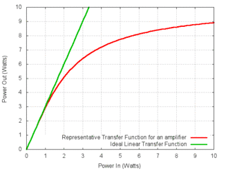 When overdriving an amplifier beyond its linear range, gain compression will occur[1] due to nonlinear circuit characteristics. The output of large amplitude inputs will be less than expected than using the small signals gain of the amplifier, such that an increase in input will not be matched by a proportional increase in output. Gain compression is the difference between the ideal linear power transfer curve and the real circuit's power transfer curve.