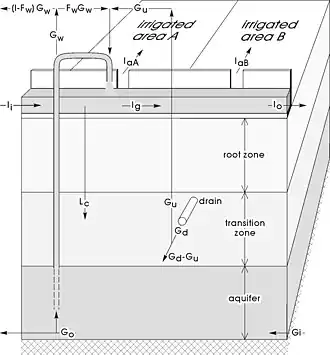 Aquifer conditions in irrigated land and the groundwater flow have an important role in soil salinization,[3] as illustrated here: