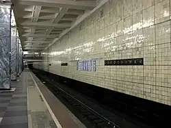 The station was designed by architects Ivan Taranov and Nadezhda Bykova and features tiled walls and pillars faced with grey-blue Ufaleymarble. A model of the station was awarded a Grand Prix at the 1937 ParisWorld's Fair.[1]