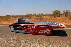 The MTAA SuperCharge 2 is the second solar car from the ANU. Designed for the 2019 Bridgestone World Solar Challenge (BWSC). Building on the experiences and lessons from 2017, the team undertook a complete redesign and built a new car from the ground up. The team featured some familiar solar car faces as well as a host of new members to lean and bring their skillsets to the project. Over the last 2 years, behind the scenes; these students have worked tirelessly to produce this car and have also used the platform to promote renewable energies and STEM. The team proved the reliability of MTAA SuperCharge 2 throughout the 2019 BWSC with only minor issues during hundreds of kilometres of testing and the race; managing to drive 1500 km off the sun.[6]