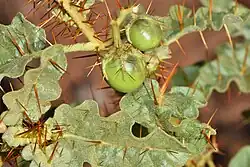 Solanum petrophilum leaves are 2–8 cm (0.8–3.1 in) long ovate-lanceolate to oblong in shape, usually greyish-green in colour on the upper leaf and greenish-white to grey or yellow on the lower leaf surface.[2][4] The leaf margin has 3-6 undulating shallow or deep rounded lobes and has a truncate to cordate base.[2][4][5] The prickles occur on the mid-vein of the leaf and sometimes on the mid-vein and lateral veins.[5]