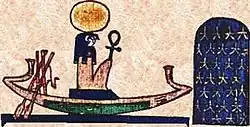 The Sun's movement across the sky represents a struggle between the pharaoh's soul and an avatar of Osiris. Ra travels across the sky in his solar-boat; at dawn he drives away the god of chaos, Apep.[39][40] The "solarisation" of several local gods (Khnum-Ra, Min-Ra, Amun-Ra) reached its peak in the period of the Fifth Dynasty.[41]