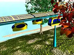 A few pilot projects have also been built in the framework of the "Heliotram" project, such as the tram depots in Hannover Leinhausen[25] and Geneva (Bachet de Pesay).[26] The 150 kWp Geneva site injected 600 V DC directly into the tram/trolleybus electricity network provided about 1% of the electricity used by the Geneva transport network at its opening in 1999. On 16 December 2017 a fully solar-powered train was launched in New South Wales, Australia.[27] The train is powered using onboard solar panels and onboard rechargeable batteries. It holds a capacity for 100 seated passengers for a 3 km journey.