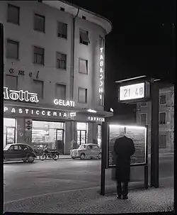 The company's Cifra 5 clock was awarded the Compasso d'Oro in 1956.[2] In this year, Solari sold its first moving sign to Liege railway station in Belgium. It subsequently sold thousands to airports and train stations. There is no known record of surviving Solari split-flap displays, though hundreds have been replaced with more modern displays across the world.[1]