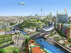 After visual artist Olivia Louise posted concept art on Tumblr of a solarpunk aesthetic in 2014,[15] researcher Adam Flynn contributed to the science fiction forum Project Hieroglyph with further definition of the emerging genre.[16][17] Based on Flynn's notes and contributions on the website solarpunks.net, A Solarpunk Manifesto was published in 2019. It describes solarpunk as "a movement in speculative fiction, art, fashion, and activism that seeks to answer and embody the questions 'what does a sustainable civilization look like, and how can we get there?'".[18] In 2024, solarpunk entered The Encyclopedia of Science Fiction. Here, James Machell points to Songs from the Stars by Norman Spinrad as the subgenre's first text, and goes on to contrast solarpunk with cyberpunk, stating, "It is a rebellion against a rebellion, born out of dystopia fatigue."[19]