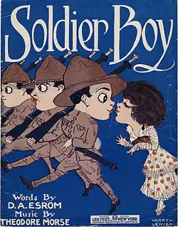 Soldier Boy is a World War I era song released in 1915. D.A. Esrom wrote the lyrics. Theodore Morse composed the music.[1] Leo Feist, Inc. of New York, New York published the song. Artist Harry Lewis designed the cover art for the sheet music. On the cover, there are three cartoon soldiers. One has his head turned to kiss a woman behind him.[2] The song was written for both voice and piano.[3] It is told from the point of view of a woman who is proud of her soldier boy. She addresses the soldier directly in the chorus: [1]