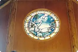 One of the officers in the regiment was Colonel Nelson Story, III, a resident of Bozeman, Montana, and descendant of Nelson Story, a noted Montana pioneer and land benefactor of Montana State University – Bozeman.[3] The colonel's son, Nelson Story, IV, died in combat early in the war. The colonel donated the land, drew the basic design, wrote the charter, and donated most of the money for the chapel. Soldiers Chapel is dedicated to both the regiment and to Nelson Story, IV. About twenty veterans of the regiment attended 50th anniversary celebrations of the chapel on 29 May 2005. A memorial plaque near the front door lists all the members of the regiment who died in the war. The plaque cites "Those immortal soldiers of the 163rd Infantry who, with courage and devotion, died in pain defending their country and the cause of freedom for all men."[4] The stained glass, created by Associated Crafts-Willet-Hauser Architectural Glass of Winona, MN in the front door shows the hand of God reaching down to a wounded soldier on a tropical beach. The motif was designed by regimental veteran Sergeant Jack C. Gunter.[4][3]