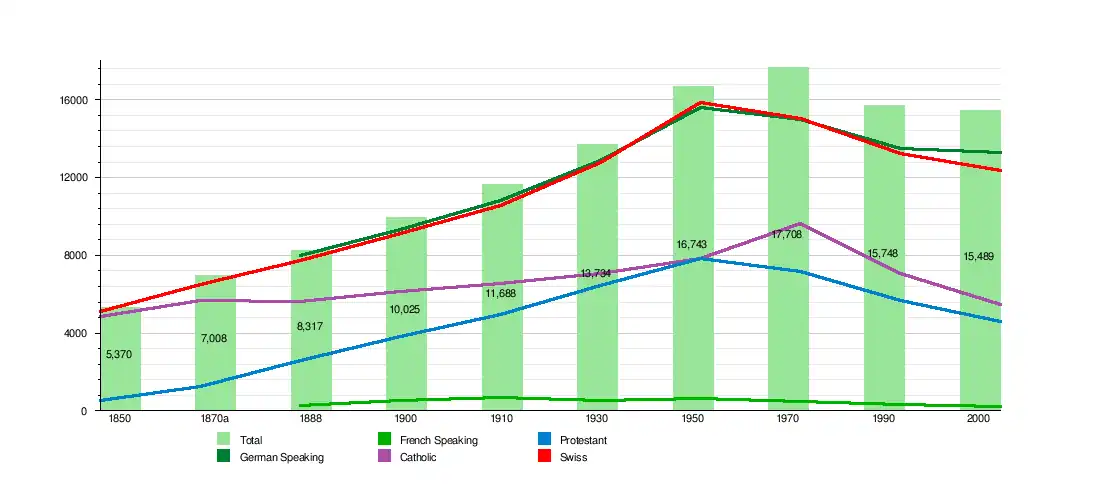As of 2008, the gender distribution of the population was 48.1% male and 51.9% female. The population was made up of 5,891 Swiss men (37.0% of the population) and 1,775 (11.1%) non-Swiss men. There were 6,669 Swiss women (41.8%) and 1,604 (10.1%) non-Swiss women.[19] Of the population in the municipality 3,864 or about 24.9% were born in Solothurn and lived there in 2000. There were 3,630 or 23.4% who were born in the same canton, while 4,135 or 26.7% were born somewhere else in Switzerland, and 3,193 or 20.6% were born outside of Switzerland.[18]