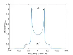 The dipolar powder pattern (also Pake pattern) has a very characteristic shape that arises when two nuclear spins are coupled together within a crystallite. The splitting between the maxima (the "horns") of the pattern is equal to the dipolar coupling constant .:[8]